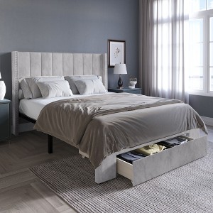 This platform bed frame blends classic style with everyday function. Perfect for compact or refined spaces, it features a wingback headboard with modern channeled tufting and nailhead trim for a sophisticated look. A spacious drawer at the footboard offers convenient storage to help keep your room tidy and organized. Crafted from solid wood and padded with plush foam, the frame is upholstered in soft, skin-friendly velvet for a luxurious feel. Twelve sturdy wooden slats provide strong mattress support, eliminating the need for a box spring. Ships in one box for easy delivery and hassle-free assembly. Available in Twin, Full, Queen, and King sizes, and offered in three timeless colors to suit any bedroom décor.
