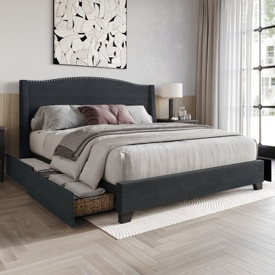 Add a touch of elegance and practicality to your bedroom with this stylish wingback headboard platform bed. Featuring a refined wingback silhouette and highlighted with polished chrome nailhead trim, it brings a sophisticated flair to any décor. Upholstered in premium 100% polyester linen fabric, the headboard offers a timeless look and soft texture. Designed with functionality in mind, this bed includes four smooth-glide metal drawers—ideal for keeping your bedroom essentials neatly tucked away. Built from a combination of solid rubberwood, MDF, and LVL, the frame offers lasting strength and stability. This platform bed eliminates the need for a box spring, simplifying your setup. Available in three versatile colors—Charcoal Grey, Beige, and Light Grey—you can choose the perfect match for your space. The bed ships with clear, step-by-step assembly instructions, making installation quick and easy. Upgrade your bedroom with the perfect blend of style, storage, and comfort.