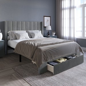 This platform bed frame blends classic style with everyday function. Perfect for compact or refined spaces, it features a wingback headboard with modern channeled tufting and nailhead trim for a sophisticated look. A spacious drawer at the footboard offers convenient storage to help keep your room tidy and organized. Crafted from solid wood and padded with plush foam, the frame is upholstered in soft, skin-friendly velvet for a luxurious feel. Twelve sturdy wooden slats provide strong mattress support, eliminating the need for a box spring. Ships in one box for easy delivery and hassle-free assembly. Available in Twin, Full, Queen, and King sizes, and offered in three timeless colors to suit any bedroom décor.