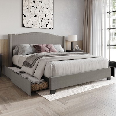 Add a touch of elegance and practicality to your bedroom with this stylish wingback headboard platform bed. Featuring a refined wingback silhouette and highlighted with polished chrome nailhead trim, it brings a sophisticated flair to any décor. Upholstered in premium 100% polyester linen fabric, the headboard offers a timeless look and soft texture. Designed with functionality in mind, this bed includes four smooth-glide metal drawers—ideal for keeping your bedroom essentials neatly tucked away. Built from a combination of solid rubberwood, MDF, and LVL, the frame offers lasting strength and stability. This platform bed eliminates the need for a box spring, simplifying your setup. Available in three versatile colors—Charcoal Grey, Beige, and Light Grey—you can choose the perfect match for your space. The bed ships with clear, step-by-step assembly instructions, making installation quick and easy. Upgrade your bedroom with the perfect blend of style, storage, and comfort.