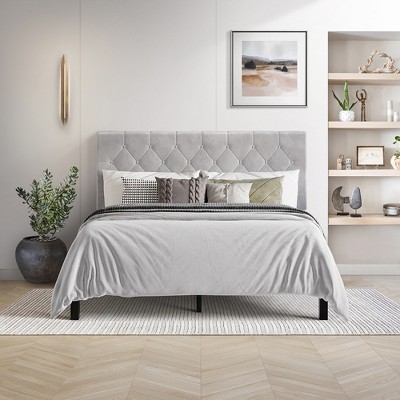Elevate your bedroom with this elegantly crafted bed, built from durable solid wood and upholstered in plush 100% polyester velvet. The headboard features timeless diamond button tufting, a graceful wingback silhouette, and refined nailhead trim—making it a sophisticated focal point that complements any décor. Merging style with everyday practicality, this bed offers both elegance and functionality for modern living. Available in Twin, Full, Queen, and King sizes to fit any space, and offered in six stunning colors—Silver Grey, Light Grey, Light Blue, Black, Light Pink, and Navy Blue—to suit your personal style. A box spring or foundation is required for optimal support. Ships in one box with all hardware included for quick and easy assembly.