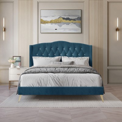 This platform bed frame blends classic style with everyday function. Perfect for compact or refined spaces, it features a wingback headboard with modern channeled tufting and nailhead trim for a sophisticated look. A spacious drawer at the footboard offers convenient storage to help keep your room tidy and organized. Crafted from solid wood and padded with plush foam, the frame is upholstered in soft, skin-friendly velvet for a luxurious feel. Twelve sturdy wooden slats provide strong mattress support, eliminating the need for a box spring. Ships in one box for easy delivery and hassle-free assembly. Available in Twin, Full, Queen, and King sizes, and offered in three timeless colors to suit any bedroom décor.