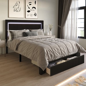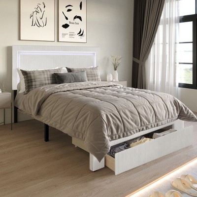 Add a touch of glam to your bedroom with this luxurious upholstered platform bed frame, where style meets smart functionality. Wrapped in soft, pleated velvet that’s gentle to the touch, it features built-in LED lighting to give your space a sleek, modern glow. Thoughtfully designed for both elegance and efficiency, the bed includes a spacious, smoothly gliding drawer—perfect for storing clothes, bedding, toys, or personal essentials—keeping your room organized without compromising on style. Crafted to stand out, this statement piece is available in three sophisticated colors—White, Black, and Grey—each offering a unique vibe to complement your décor. The platform base includes 12 durable wooden slats, eliminating the need for a box spring. Ships in one convenient box with full assembly required.