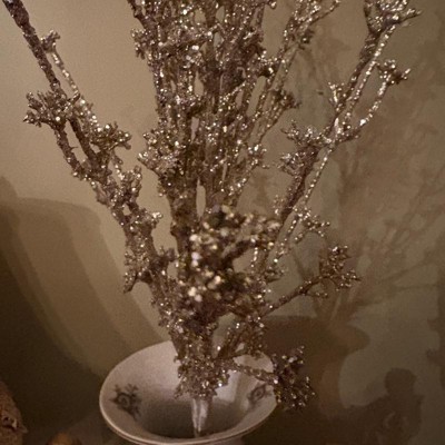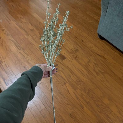 Spruce up your living space all year round with this Champagne Shimmer Christmas Stem from Threshold™. This 28-inch stem features multiple branches with rice flowers covered with champagne shimmer detailing for a gorgeous look that blends well with various decor styles. Display the shimmery stem alone or as part of a larger arrangement for an elegant touch.