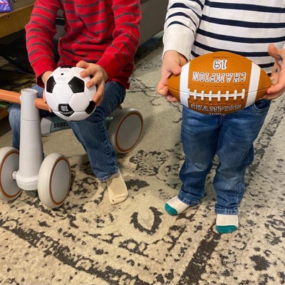 [This review was collected as part of a promotion.] Champion soccer ball, football, and basketball, perfect size for young kids to throw around and kick. Great for ages 1-4. All three balls very good quality and well made. The balls came slightly flat (the soccer ball in particular), so a ball pump is needed upon purchase. I like the size for the targeted age group. Football and basketball easy to grip for throwing.