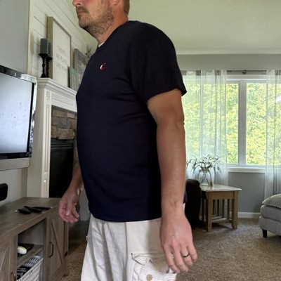 [This review was collected as part of a promotion.] This iconic essentials shirt from champion is a really nice fit and quality men’s shirt as featured on my partner whom is absolutely a large in everything and is wearing a large. He is about six foot tall 190 pounds, athletic build. The shirt fits just right in the arms and body giving shape but not being too tight or too loose and just hanging there. This is a decently priced shirt for the nice look it provides. I received an incentive to write this review.