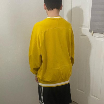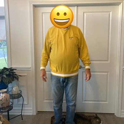 [This review was collected as part of a promotion.] I purchased this men's athletic sweatshirt online for my husband. This crewneck sweatshirt has a collegiate sports team look and feel to it. It's like a vintage sweatshirt (but new). My husband like the mustard yellow color (even though i thought it was a little bold). And he likes the way that it fits him. It's more of a relaxed fit and he said it feels comfortable, like its already broken in. He is wearing a size XL, which is what he usually wears in tops and jackets. He is 6'2" and weighs approximately 215 lbs. It was a little bit pricey in my opinion for what we got, but he's happy with it. I received an incentive to write this review.