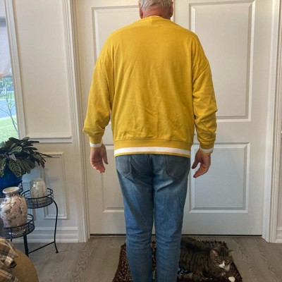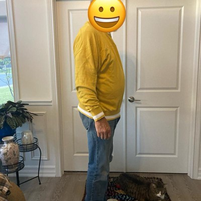 [This review was collected as part of a promotion.] Oh this M size fits perfectly for my husband and he’s usually wearing size M and this more like size, L so don’t get bigger size. Also, this is so comfy and butter smooth. Perfect for our fall picture and Thanksgiving. Also, there’s so much space on arms and upper body for my husband to move freely. Lastly, my favorite is this is very rare to find great yellow long sweatshirt, and looks so good in real life I received an incentive to write this review.