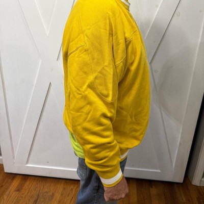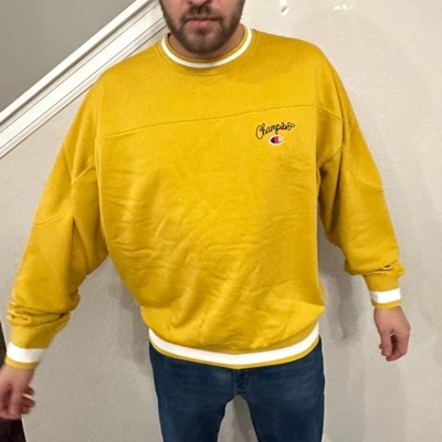 [This review was collected as part of a promotion.] This yellow sweater from champion is photographed in a size large. This sweater has cuffs at the waist and sleeves. This sweater runs true to size. This is a fun fall color for any fashionable or trendy man who wants to stand out in a crowd. This mustard type yellow is a great addition to your wardrobe for fall. The material on this is thick and warm. This would be great for an evening out and could be dressed up with nice pants. I received an incentive to write this review.