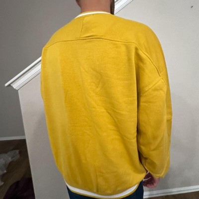 [This review was collected as part of a promotion.] This is a nice unique sweatshirt in a mustard yellow color. The inside isn’t soft and fuzzy, and the outside is more of a thick rough feel. The sweatshirt is pretty heavy so you can feel it’s good quality. I like the stripes around the cuffs and hem of the shirt. This is great for fall or wearing under a winter coat. Pair this with jeans to wear out or sweatpants when lounging at home. I’m 5’10” and 185lbs wearing a size medium and it is intentionally relaxed. I received an incentive to write this review.
