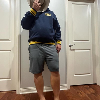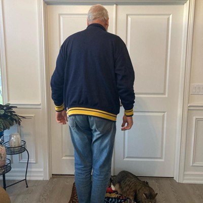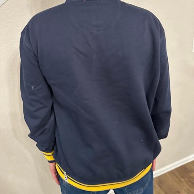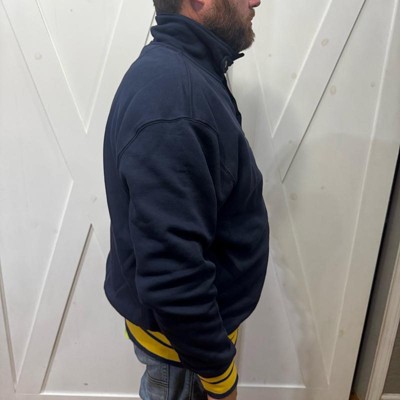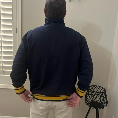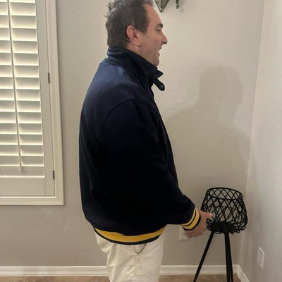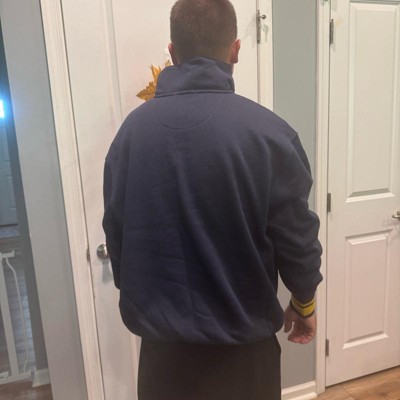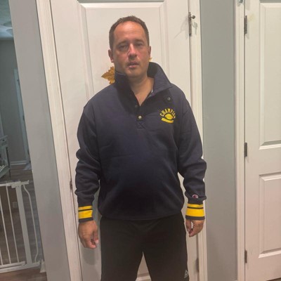 [This review was collected as part of a promotion.] I purchased this men's sweatshirt online for my husband. This navy blue mock neck style sweatshirt looks like a varsity style jacket for an adult. It's got a football emblem in the corner and bold yellow cuffs and accents. It looks good with the collar snapped closed or worn open. This is nice to wear to football games or anywhere really. My husband likes the fit and the style of it. He is wearing a size xl and I think it fits true to size. He weighs approximately 215 lbs and is 6'2". This was in my opinion a bit on the more expensive side for the style, but he likes it and said he will get a lot of wear out of it. I received an incentive to write this review.
