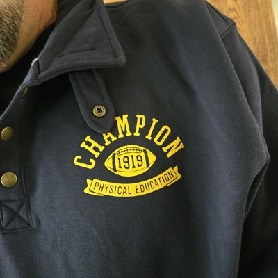 The classic mock neck sweatshirt just got a varsity-inspired update. Equal parts cozy and refined, the men’s Champion Phys-Ed Snap Mock Neck Sweatshirt is made from midweight fleece with a garment enzyme wash for a lived-in, yet structured look. In a standard fit, this comfortable sweatshirt features dropped shoulders, a yarn-dyed stripe ribbed trim, and mock neck design that’s secured by a metal “C” logo snap. A “Champion Physical Education” and football puff print graphic adds retro athletic style, while an iconic embroidered “C” patch at the sleeve makes for an unmistakably Champion finish.