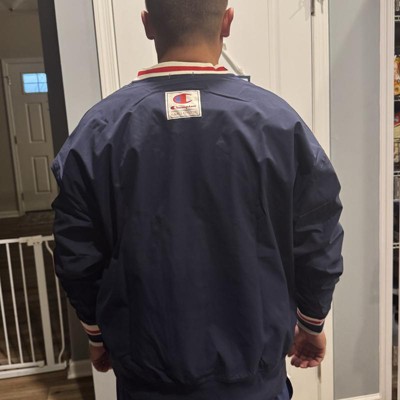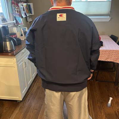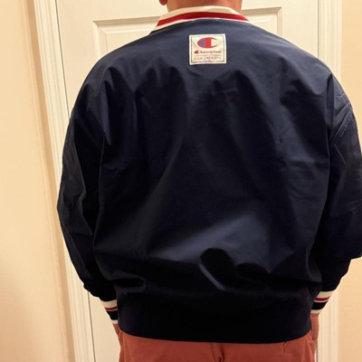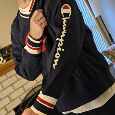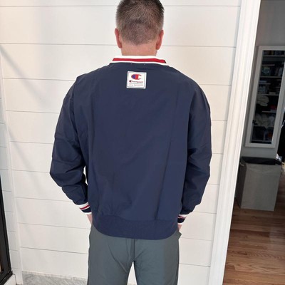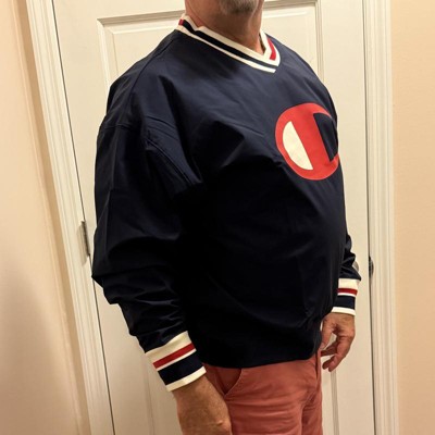 [This review was collected as part of a promotion.] (6'1" 200 Lbs - Size XL) I recently purchased this Gridiron Vneck Windbreaker by Champion and I'm in love with it! Very retro feeling - takes me back to the early 90s with the style and feel. There is a nice/soft under layer beneath the Windbreaker material. The colors on the neck, sleeves, chest, and arms are eye catching and add a nice touch to the jacket. Only thing it's missing is a pocket. Would recommend! I received an incentive to write this review.