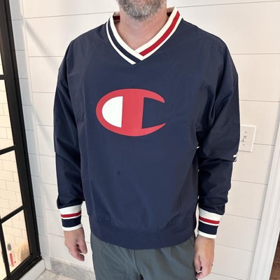 Gear up for brisk days and cool nights in varsity-inspired style. Enter: The men’s Champion Gridiron V-Neck Pullover. Made from durable Aqua Shield woven polyester, this lightweight pullover is cut into a standard fit for easy movement. With a big, bold “C” front graphic and “Champion” script on the sleeve, this pullover is all about game-day energy, while dropped shoulders and striped ribbed trims nod to old-school gridiron days. An iconic canvas patch at the back neckline lends a signature finish to make this V-neck pullover the perfect top layer when the temp starts to dip.