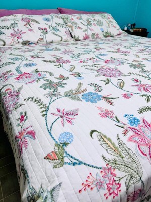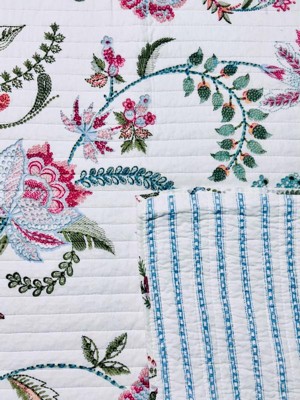 The Chantae Reversible Quilt Set by Levtex Home is inspired by a blooming floral vine garden. Offered in white, blue, magenta and green, this design will immediately transform your bedroom. This reversible quilt features an array of colorful blooming flowers and vines on the front, reversing to a a blue and white ticking stripe on the back. The Quilt and Sham have a cotton front and back, filled with a cotton-rich filler, and are machine washable. Enjoy this for years to come!