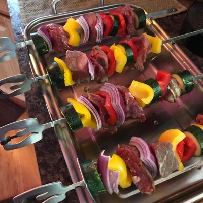 - Wide construction prevents food from turning when rotating skewers