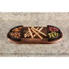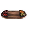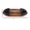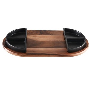 Kalmar Home's Acacia Wood Charcuterie and Serving Tray - complete with 4 Black Triangular Ceramic Dishes - seamlessly blends functionality with elegance.Made from solid acacia wood, known for its durability and distinct grain patterns, this 20" x 11" board is built to withstand the demands of daily use.The contrasting black color of the dishes against the natural acacia wood creates a visually stunning display.The striking triangular ceramic dishes each measure 4" x 4" x 4" and are designed to hold a variety of culinary items and fit perfectly within the routed areas to avoid unnecessary movement or spillage.Each piece is meticulously handcrafted to highlight the natural beauty of the acacia wood, ensuring that every board is unique and possesses its own distinct character.We recommend hand-washing with mild soap and warm water to maintain its beauty and integrity for years to come. To preserve the wood's natural luster, occasional oiling with food-grade mineral oil is recommended.