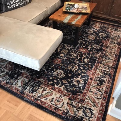 After searching high and low for a rug that matched my needs, I finally found it! The rug has beautiful hints of light, blue, dark blue and navy as well as some gray. It is a pretty design and has more of a gray SH backing so you can’t tell that it’s super dirty. I have a one year-old son, and I wanted him to be able to have some thing to play on but not feel nervous about it getting ruined. I feel like this rug that our need.