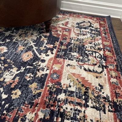 After searching high and low for a rug that matched my needs, I finally found it! The rug has beautiful hints of light, blue, dark blue and navy as well as some gray. It is a pretty design and has more of a gray SH backing so you can’t tell that it’s super dirty. I have a one year-old son, and I wanted him to be able to have some thing to play on but not feel nervous about it getting ruined. I feel like this rug that our need.