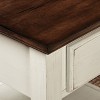 - Features distressed off-white finish with chestnut tabletop