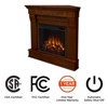 The Chateau corner electric fireplace has a classic look and a clean, crafted style making it a stunning addition to any room. With a unique corner design, this fireplace can fit into smaller spaces like bedrooms, apartments or offices. The Real Flame® VividFlame™ electric firebox mimics the look of a real, flickering fire, but does not require a chimney or vents and conveniently plugs into a standard outlet. This free-standing indoor fireplace has a mantel with a real wood finish and features six flame colors, five flame brightness levels, adjustable thermostat, timer function and automatic safety shut-off. The electric fireplace insert provides supplemental heat for rooms up to 1,000 sq ft or the heater can be turned off so you can enjoy the comforting ambiance of a glowing fireplace year-round. Mantel, firebox with log set, hardware and remote control are included.