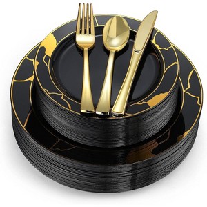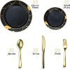 - ELEGANT BLACK & GOLD DISPOSABLE DINNERWARE: Black and gold plastic plates with matching utensils elevate the look and feel of this disposable dinnerware making it the perfect choice for birthdays, weddings, holidays, graduations, bridal or baby showers.