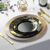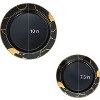 - STYLISH BLACK & GOLD TABLE: The full set creates a stylish and coordinated table for up to 36 guests. A 180-piece set has 36 forks, 36 knives, and 36 spoons in gold. There are 36 black with gold accent plates in both 10” dinner and 7.5” sizes.