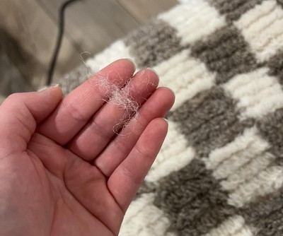 I liked everything about this checkered ottoman….the style, the color, the size and especially the 75% clearance. It was a surprise purchase that was meant to be. And has been mentioned before, it sheds dramatically. A good vacuuming minimizes the shed. It is very comfy.