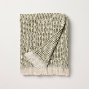 Keep your space warm and stylish with this Checkered Knit Throw Blanket from Hearth & Hand™ with Magnolia. This throw blanket showcases a checkered knit design in green with cream fringed edges for a lovely look that blend effortlessly with any decor style. Made from cotton-linen blend jacquard fabric, this knitted blanket is super soft to the touch and perfect for snuggling up while you nap or watch some TV.