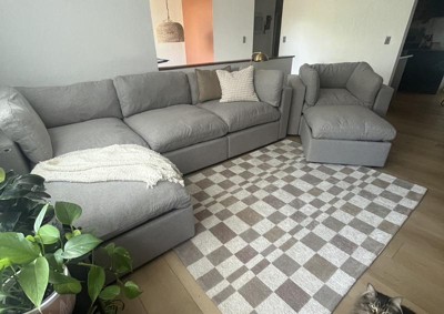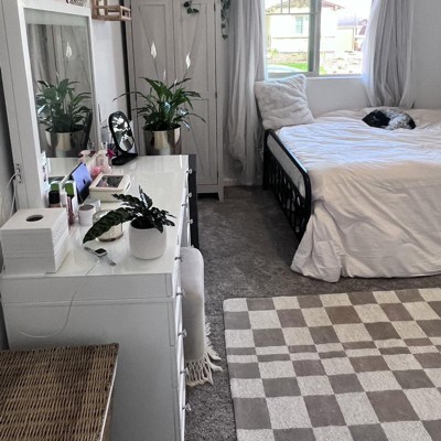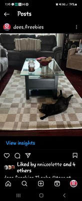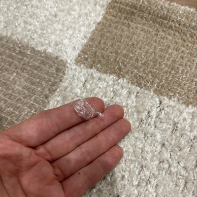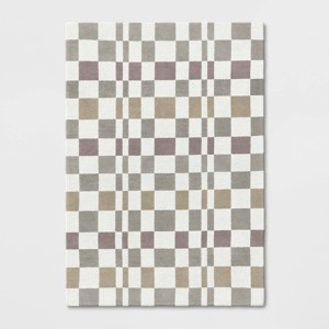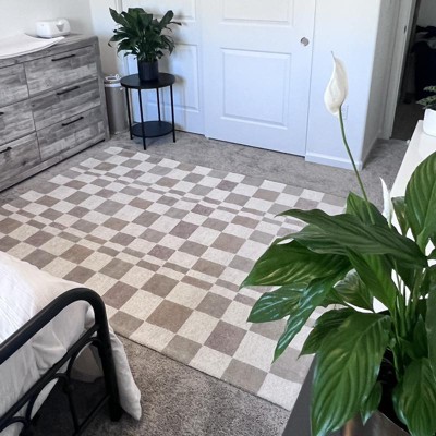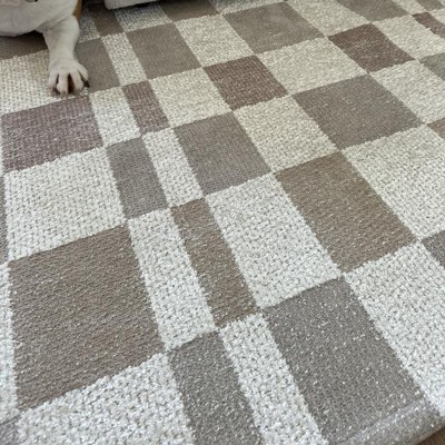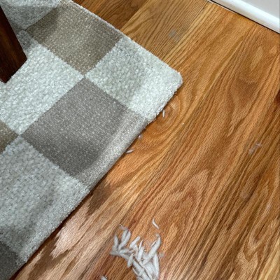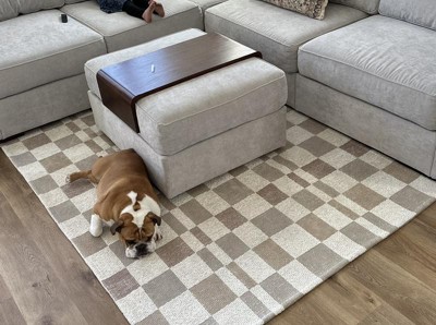 A: Hi Sue - Thank you for the inquiry. Rug has gray, white and tan colors on it. Featuring a checkered pattern for a modern look, this woven area rug offers soft underfoot comfort, while the cotton backing helps prevent sliding to keep it firmly in place. Hope this helps! - Kris