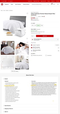 This seems like a reasonably nice comforter, but I am extremely disappointed that the description says it has a 100% Cotton Cover yet the government mandated tags say 100% Microfiber which means Polyester! (See attached pictures). The Kapok filling is cozy and heavier than I expected. This comforter feels like a very nice halfway point between wool and down filling. It is heavy but still fluffy. I initially intended for it to be a 3 season comforter for use in the Summer, but I think it is too heavy for that. Note that I cannot recommend this in good conciense since the website description and the product labeling disagree on the material content of the cover.