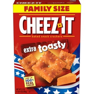 Make patriotic celebrations more fun with Cheez-It Extra Toasty baked snack crackers and this limited edition red, white and blue packaging. These Cheez-It crackers have been baked to crisp, toasty perfection and are made with 100% real cheese that's been perfectly aged for a bold, delicious flavor. Cheez-It crackers are great for summer BBQs, party spreads, afternoon snacks, snacks at the office, late-night munching and more; the cheesy options are endless. Ideal for on the go too, Cheez-It crackers are great to bring along on trips to the park, field trips, camping, hiking, picnics, outdoor concerts, everyday errands, and more. The antidote to flavorless crackers, Cheez-It Extra Toasty crackers are packed with irresistible cheesy flavor and are a great addition to homemade snack mixes and party mixes. You'll love the one-of-a-kind flavor of real cheese in every tasty handful of Cheez-It Extra Toasty baked snack crackers.