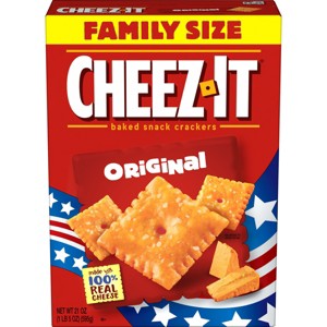 Make patriotic celebrations more fun with Cheez-It Original baked snack crackers and this limited edition red, white and blue packaging. These Cheez-It crackers have been baked to perfection and are made with 100% real cheese that's been perfectly aged for a bold, delicious flavor. Cheez-It crackers are great for summer BBQs, party spreads, afternoon snacks, snacks at the office, late-night munching and more; the cheesy options are endless. Ideal for on the go too, Cheez-It crackers are great to bring along on trips to the park, field trips, camping, hiking, picnics, outdoor concerts, everyday errands, and more. The antidote to flavorless crackers, Cheez-It Original crackers are packed with irresistible cheesy flavor and are a great addition to homemade snack mixes and party mixes. You'll love the one-of-a-kind flavor of real cheese in every tasty handful of Cheez-It Original baked snack crackers.