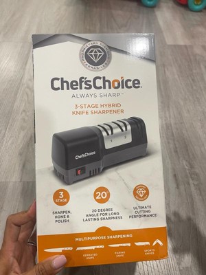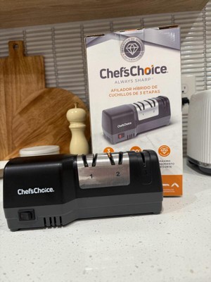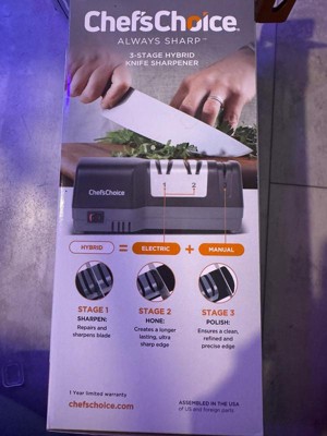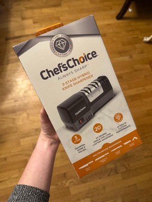 Elevate your cooking experience with sharper knives. The Chef'sChoice 3-Stage Hybrid Knife Sharpener is the ultimate solution to restore and maintain razor-sharp blades at home. Say goodbye to dull knives, sharpen them with confidence. Dull knives not only slow you down but also make cooking less safe. This electric and manual knife sharpener is designed to restore, maintain, and protect your blades with precision, so you can chop, slice, and carve effortlessly. Featuring a 3-stage sharpening system, this hybrid model combines the convenience of electric power with the control of manual honing. Stage 1 uses advanced 100% diamond abrasives to quickly repair and sharpen dull edges, restoring cutting power in minutes. Stage 2 relies on ultra-fine ceramic honing to refine the blade, ensuring long-lasting sharpness and edge durability. Finally, Stage 3 delivers a manual polish, creating a smooth, razor-sharp finish ideal for everything from chopping vegetables to carving meats. With built-in angle guides, the Chef’sChoice Hybrid Sharpener ensures consistent, reliable results every time—whether you’re sharpening a chef’s knife, santoku knife, or serrated blade. Compact, safe, and easy to use, it’s perfect for both beginners and experienced home chefs. More than just a diamond knife sharpener, this versatile tool extends the life of your knives and makes everyday cooking faster, safer, and more enjoyable. Upgrade your kitchen with precision sharpening technology trusted by professionals and loved by home cooks. Don’t settle for dull blades, extend the life of your knives and enhance every cut with Chef'sChoice.