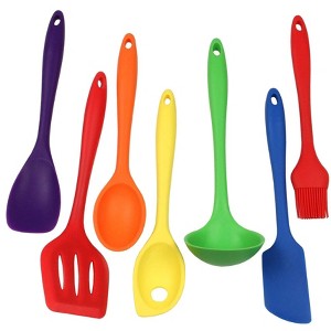 - This 7-piece silicone set includes a turner, cooking spoon, mixing spoon, ladle, spatula, spoonula, and basting brush