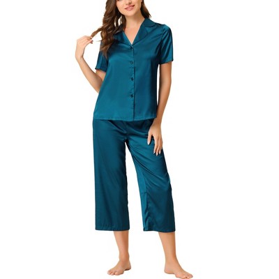 INSPIRE CHIC Women's Satin Lounge Set Button Down Short Sleeve Shirt and Shorts 2-Piece Sleepwear Pajama Sets Large Peacock Blue