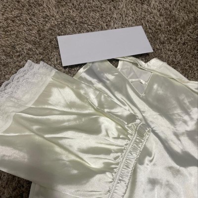 It is most definitely not white. It’s yellow which is emphasized by the actually white lace on the hem of the shorts. I would describe the yellow as that shade of yellow when your white clothes ages for 40 years. Or the shade of yellow when your white garment gets water damage in the basement. It’s a little more yellow than cream. Almost like a corn silk yellow. It also runs small and won’t fit if you have any amount of chest. I’m a B cup and my chest was pressed. If you notice there aren’t any darts near the chest area and the fabric has very little stretch. Pros: +Arrived on time +Fabric is slightly more opaque than I thought it would be +Elastic waistband constructed well Cons: -Little to no stretch -Not white -Plastic hardware -Runs small -Lace on hem is a different color (white) than the garment color (yellow)