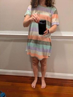 These short-sleeve shirt dresses feature colorful striped, curved hems and a regular fit, adding functionality and stylish. Practical nightshirt for everyday wear in spring, summer, or fall. With a casual round neckline, t-shirt style, and good clothes cutting, this soft basic sleepshirt is everything you need for cozy day-to-night wear. This pull-on basic shirt dress is also a good choice for short-term going out, walking around, or shopping. This nightshirt is suitable for sleeping, pajama parties, girls' days, indoors, the living room, the bedroom, etc. Multi-use T-shirt dress, for cozy loungewear, or Pair with sneakers and handbags for a casual outfit look.
