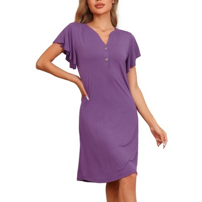 cheibear Women's Solid V-Neck Short Sleeves Long Pajama Midi Lounge Dress with Side Slit X-Small Purple
