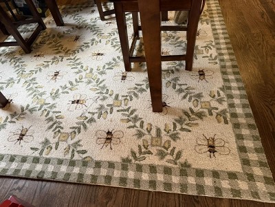 Lovely rug. High quality look and feel. Cute pattern that really suits me and anyone to likes bees or a natural cottage aesthetic. Colors match the product photo with a nice natural warm toned sage green and cream. Unfortunately for me, my cats have already pulled some loops loose from the rug, so be aware if you have cats that may mistake this for a scratch pad, it will likely show wear quickly. I think this would happen with any hand hooked rug so I don’t fault the product, just my cats! Maybe a different style rug would be better for pets but I love the look so much I took the risk.
