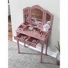 The Sanlo Wood Vanity Set features a durable wood construction with a hand-applied rose gold finish, complete with a tri-fold beveled mirror and a matching upholstered stool. Designed with four storage drawers and brushed nickel hardware, this vanity offers both style and practicality for your bedroom. Its timeless design makes it a beautiful essential for daily use or a thoughtful gift.