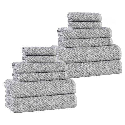 Add hotel-quality style and resort charm to every bathroom in your home with the Chevron Zero Twist Solid and Jacquard Cotton 12 Piece Bathroom Towel Set by Blue Nile Mills. Our fluffy cotton towels have a luxuriously soft feel and the zero twist weave is smooth, plush, and highly-absorbent to get you dry quickly. The medium weight thickness of each towel is versatile and perfect for the bath, poolside, or at the beach. For added style, each piece in this bundle features an elegant chevron pattern and a hanging loop for effortless drying. These towels are available in charcoal, forest green, red, peach, white, ivory, platinum grey, black, and yellow gold color options to match your bathroom decor style. This set includes 4 face towel/ washcloths, 4 hand towels, and 4 bath towels to complete your bathroom essentials.