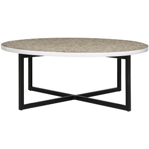 Elegant and contemporary, the Cheyenne coffee table in cream brings new meaning to modern art for the home. The ancient craft of mosaic tile work inspired this pretty piece, which contrasts a top of hexagonal shell tiles with black powder coated legs. Care Instructions: Dust regularly with a soft, dry cloth. Never use oiled or treated cloths on lacquered finishes. Some finishes can be wiped with a damp (not wet) cloth, followed at once by rubbing with a dry cloth to remove fingerprints and smudges. For persistent spots, gently clean with a soft cloth and a solution of water and mild soap, make sure to wipe dry. Use adhesive felt pads, coasters and placemats to protect your furniture.