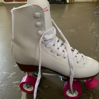 Chicago Ladies Rink Roller Skates combine a sturdy, high boot with eyelets and speed hooks to get you and the kids rolling. Lace 'em up and go-indoors or out. Sturdy construction gives you durability and top performance. White laces match the skates, but you can make them your own with different colors. Laced up, ready to roll.