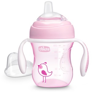 With a subtle switch from nipple to spout, the Chicco Soft Silicone Spout Transition Sippy Cup is the first step in the journey to independent drinking. Dual valves release air, so baby swallows only the good stuff. The soft silicone spout has a familiar rounded shape with a satin, non-slip texture and is completely spill-proof.