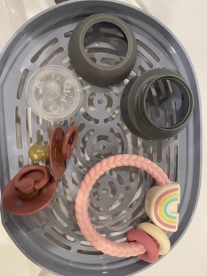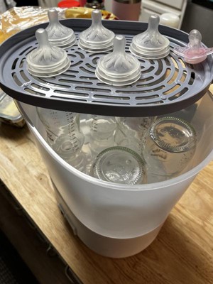 I was given this sterilizer to try as part of the Stellar Product Testing Panel. The short story is, this unit sterilizes and dries bottles and accessories extremely well. The various items I put in seemed nearly brand new after the cleaning cycle. All the films resulting from contact with milk fats and such even after washing just vanished. For that, I could give it 5 stars easily. Where it falls short is in the setup manual and configuration display. The manual simply isn’t clear and for something that really is so simple to use, it took me longer than it should have to get it going the first time for the sole reason that the instructions looked like something to accompany a toy from the 1980s. Once assembled, I had to look at the box imagery for suggestions on how to load it up. Interestingly, they clearly tried to “modernize” the control of the device with a clean looking display of various icons that light up under a glossy finish. However, because it’s all icons with no text you really have to refer to the manual to figure out how to get the machine going. There’s also not a clear indication that you have successfully started the cycle. Not at least without referring to the manual for clarification. There is an icon that changes color but it’s not initially clear what that means perhaps because there isn’t any accompanying sound. For really what is such a simple device- it steams and it dries, I don’t think a reference of a booklet should be required. It should be self explanatory. In any case, this is a retooling of a straight forward device but it does its job properly, excellently in fact, but it requires reference to get it up and running.
