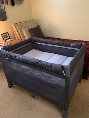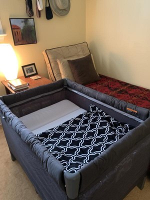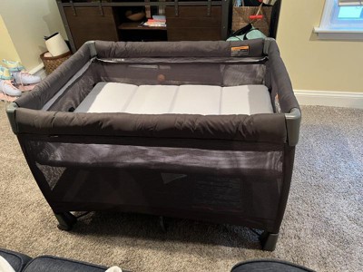 - The full-size, zip-on bassinet is raised for easy access to your infant and conveniently stays attached for next use when playard is folded. The padded mattress fits snugly in bassinet and transitions to toddler configuration as baby grows.