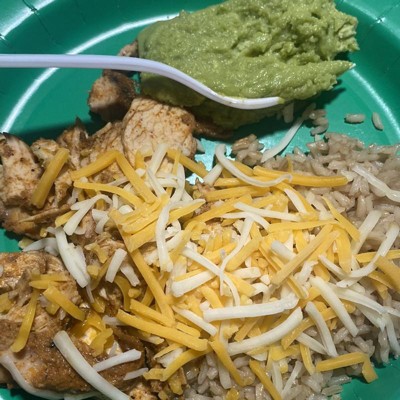 - Includes whole grain brown rice, grilled chicken fajita strips, Mexican-style shredded cheese and guacamole