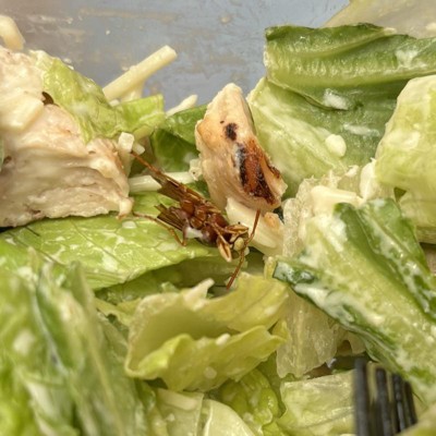 I was just enjoying this salad. And starting mixing it and stuff. The lettuce was half old. Chicken was very rubbery. and there was a moth in my salad. A moth in my salad.