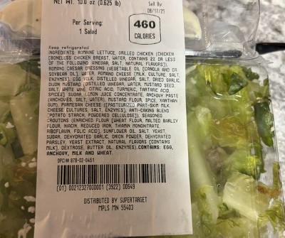 romaine lettuce, grilled chicken (chicken [boneless skinless chicken breast, water, vinegar, salt, natural flavors]), romano caesar dressing (vegetable oil [canola and or soybean oil], water, romano cheese [milk, culture, salt, enzymes], egg yolk, distilled vinegar, salt, dried garlic, dijon mustard [distilled vinegar, water, mustard seed, salt, white wine, citric acid, turmeric, tartaric acid, spices], sugar, lemon juice concentrate, anchovy paste (anchovies, salt, water), mustard flour, spice, xanthan gum), parmesan cheese (pasteurized part-skim milk, cheese cultures, salt, enzymes, anti-caking blend [potato starch, powdered cellulose]), seasoned croutons (enriched flour [wheat flour, malted barley flour, niacin, reduced iron, thiamin mononitrate, riboflavin, folic acid], sunflower oil, salt, yeast, sugar, dehydrated garlic, onion powder, dehydrated parsley, yeast extract, natural flavors [contains milk], dextrose, butter oil, enzymes)